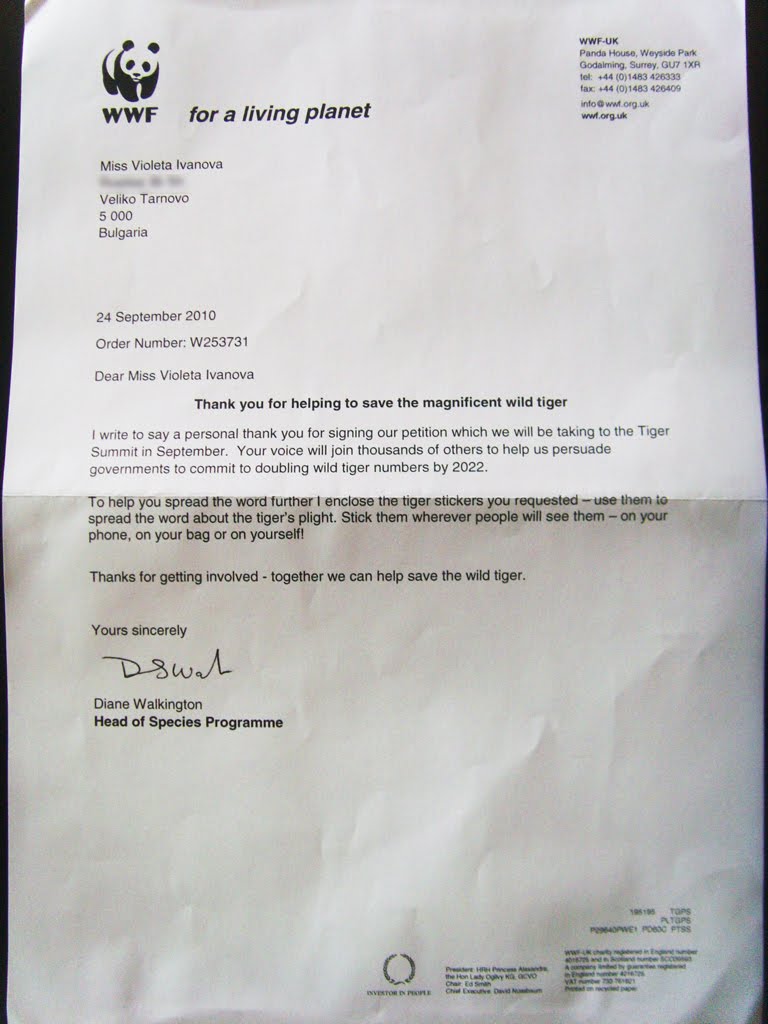 Преди време реших да подпиша една петиция за спасяване на тигрите, не толкова защото вярвам, че ще спомогна, а по-скоро от инерция. Вчера пристигна писмо с пакет стикери и някакви други екстри, та ето снимки: