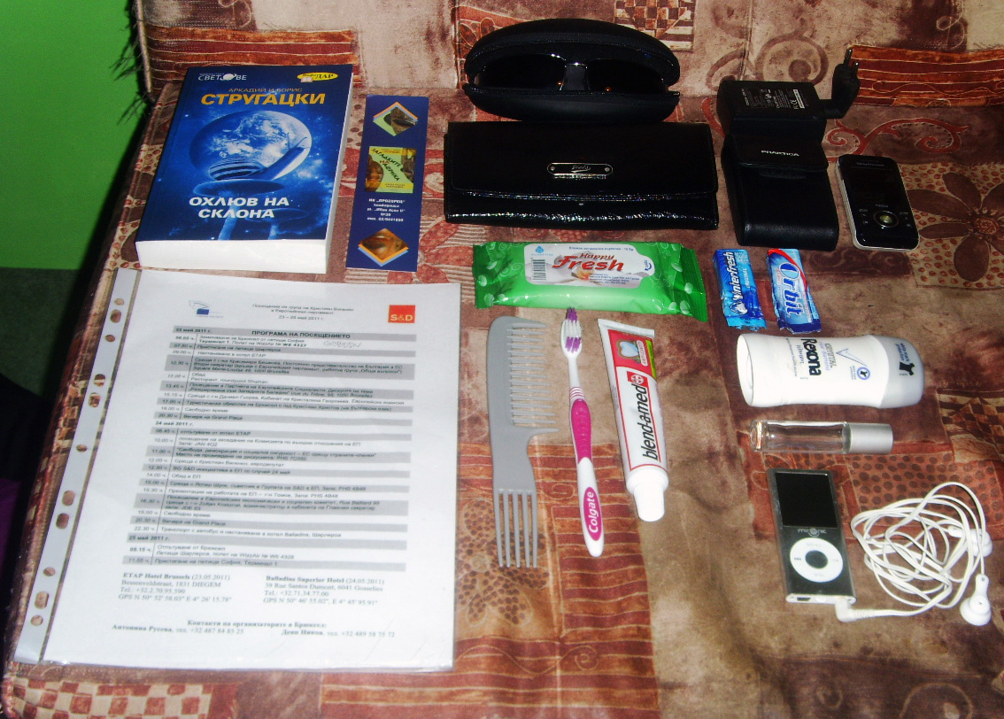 - Printed plan with what I'll meetings and visits in Sofia and during the several days in Brussels; the book is "Snail on the slope" by the Strugatsky brothers; gums are Winterfresh and dark-blue Orbit, the small bottle under the Rexona is Avon's Wink roll-on travel edition.