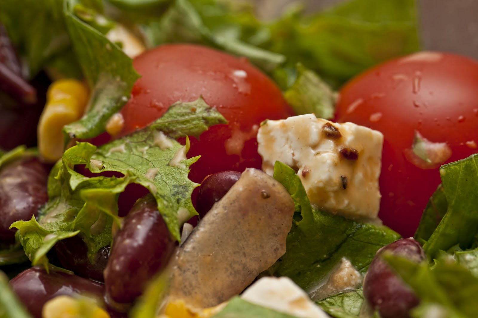salad + cherry tomatoes + red onions + greek cheese + kidney beans + sweet corn