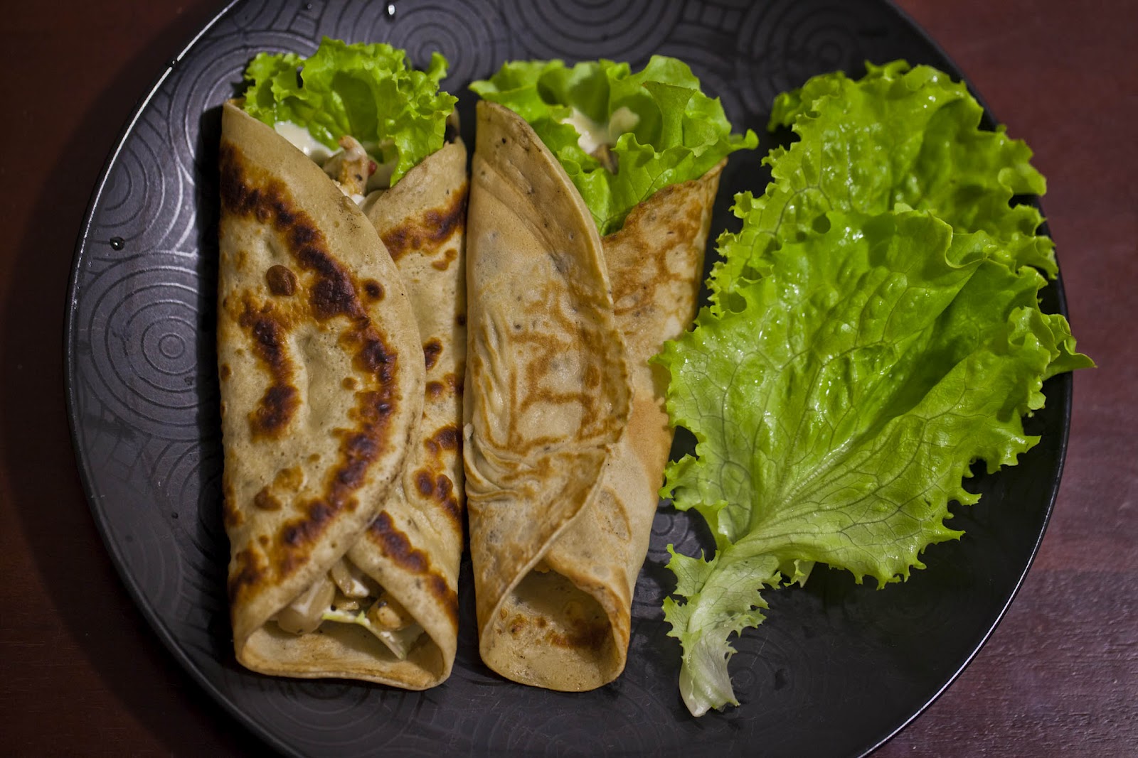 As for the filling - you can choose whatever meat you like, slice it into small pieces and fry it with mushrooms. Put on a leaf of salad, add mayonnaise and roll.