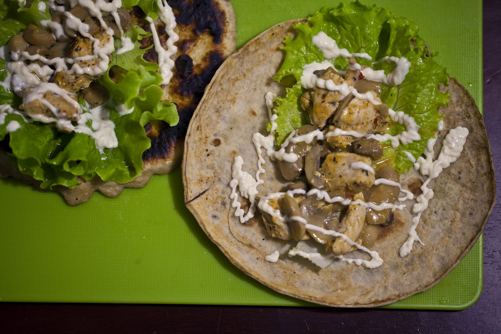 As for the filling - you can choose whatever meat you like, slice it into small pieces and fry it with mushrooms. Put on a leaf of salad, add mayonnaise and roll.